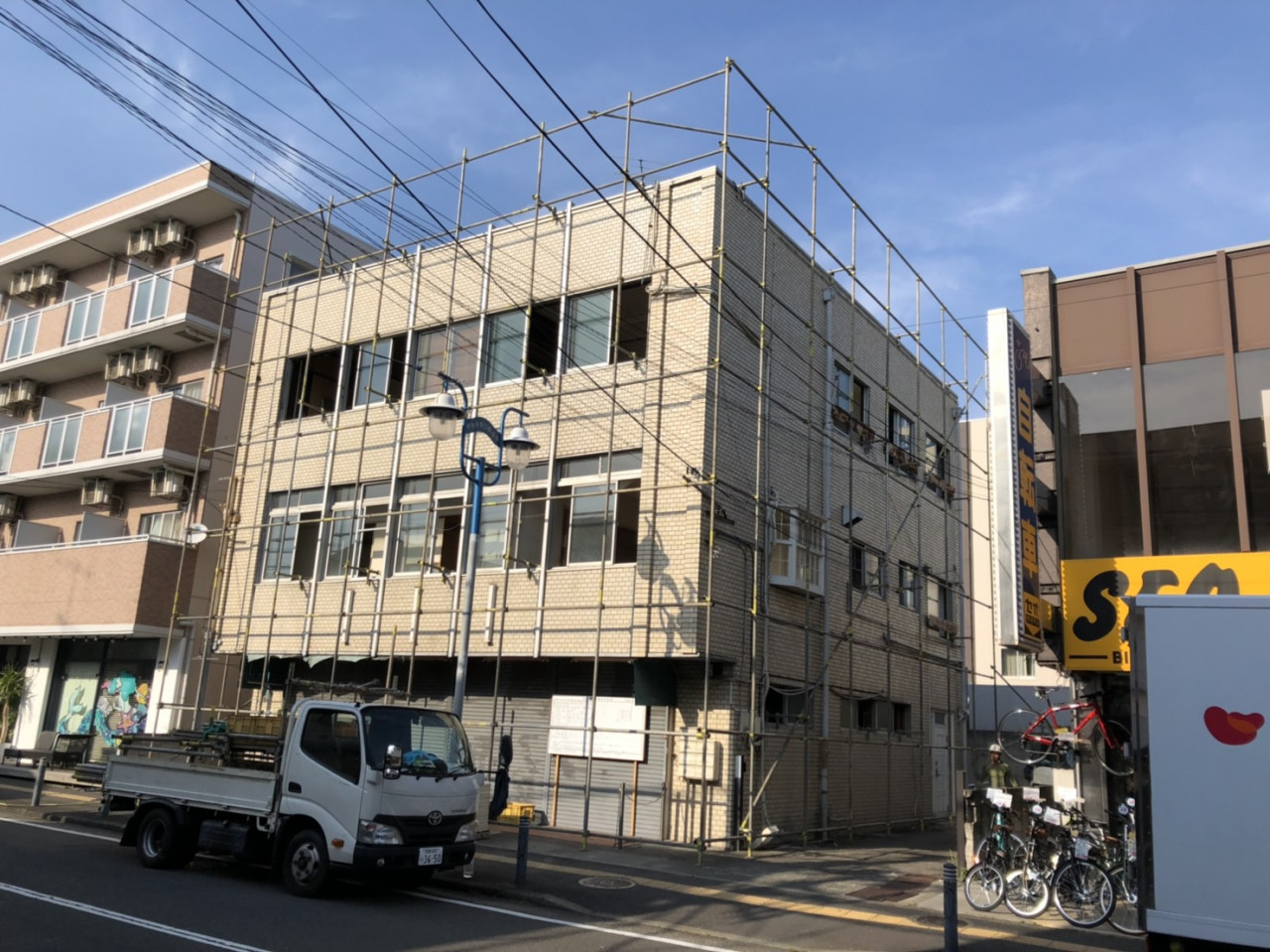 藤沢市の解体工事現場で解体養生足場仮設工事を行いました。 2019/05/29 藤沢市の解体工事現場で解体養生足場仮設工事を行いました。 こちらが単管施工・防音パネル・防音シート養生後の写真になります。 2019年5月 藤沢市で解体工事を行う現場の足場工事を行いました。 右が解体養生をした後の写真です。