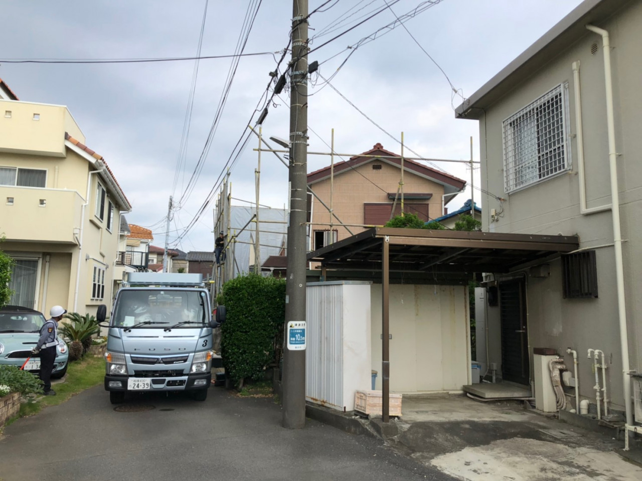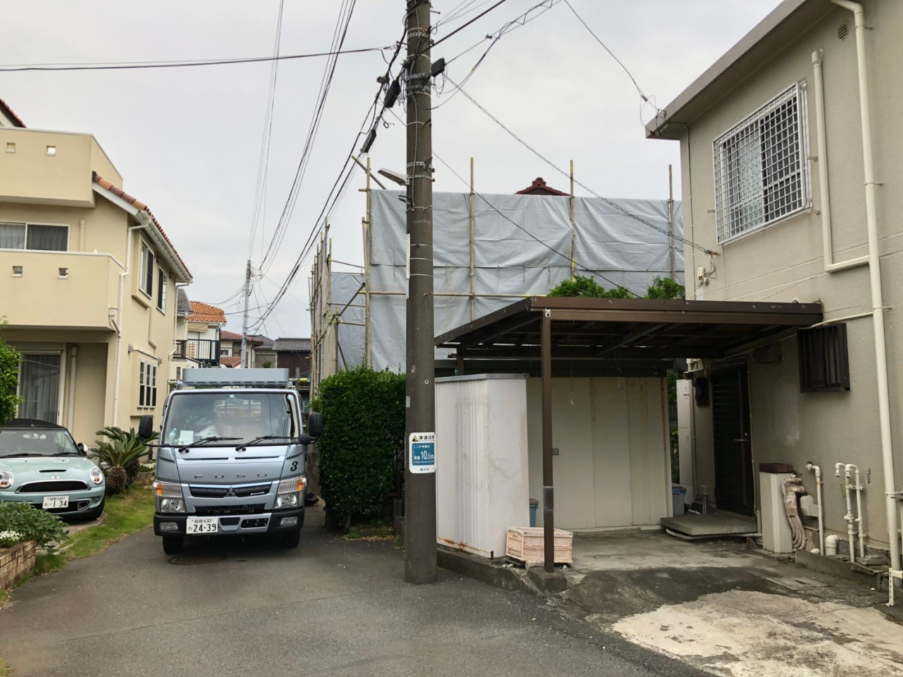 藤沢市の解体工事現場で解体養生足場仮設工事を行いました。 2019/06/13 藤沢市の解体工事現場で解体養生足場仮設工事を行いました。 こちらが単管・防炎シート養生後の写真になります。 こちらが単管・防炎シート養生後の写真になります。 2019年6月 藤沢市で解体工事を行う現場の足場工事を行いました。 右が解体養生をした後の写真です。